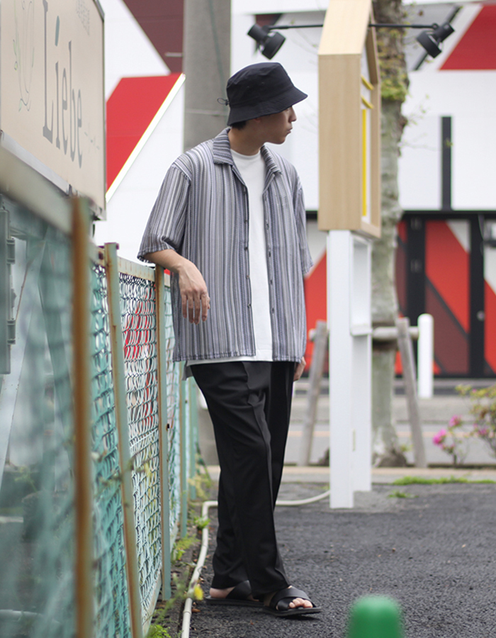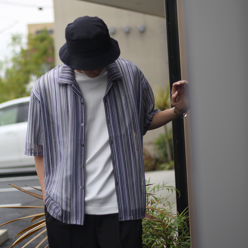 グレー×ブラックのストライプ柄を組み合わせたメッシュ編みシャツは、一枚でサマになるアイテム。