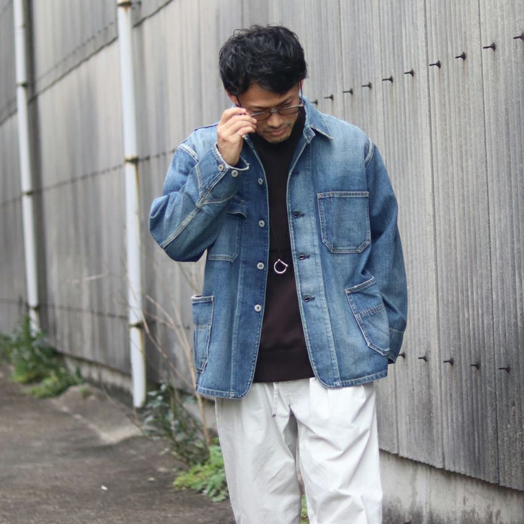 ややゆとりサイズのカバーオールと、白パンツの組み合わせで清潔感とリラックス感を両立。