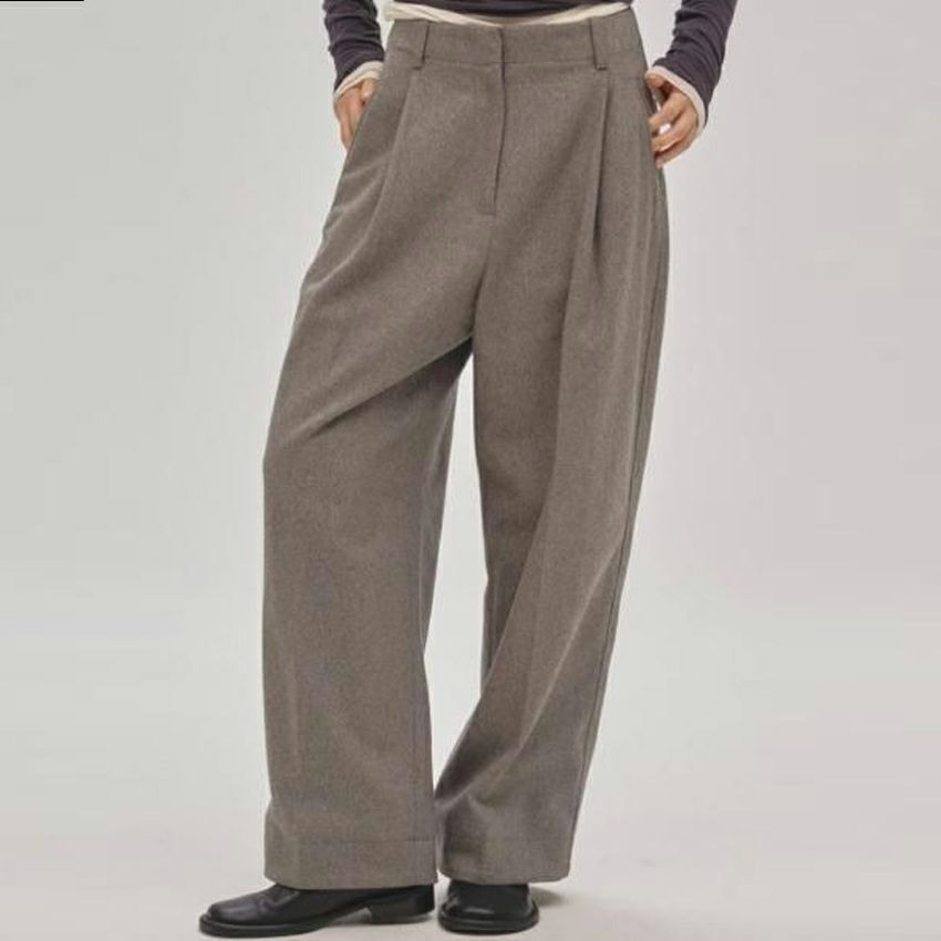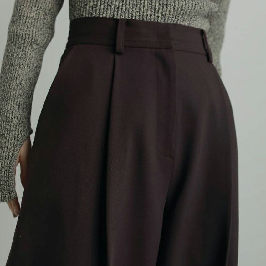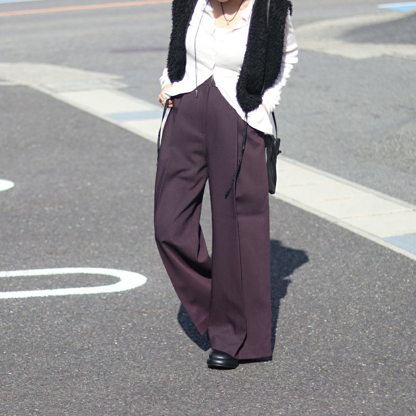 ウール混の程よくハリのある素材が、脚のラインを拾いすぎず、まっすぐ下に落ちてくれるので、自然と縦のラインが強調されます。