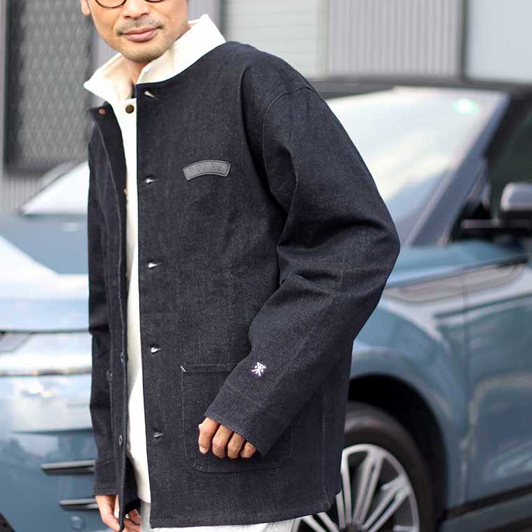 ストレッチ入りのリジッドデニムを使用したノーカラー仕様のエンジニアジャケット。