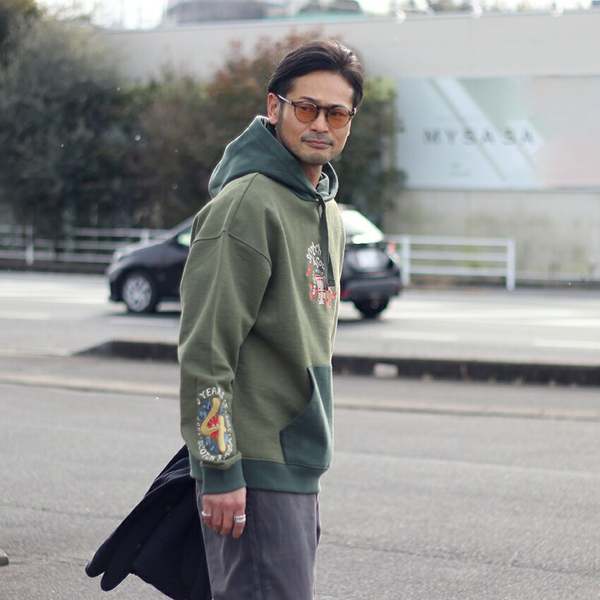 クラシックなスーベニアジャケットをベースに、ブルーの面はキルティング仕様でスポーティーな雰囲気、グリーンの面はレトロでルードな雰囲気と2面性のあるデザイン。