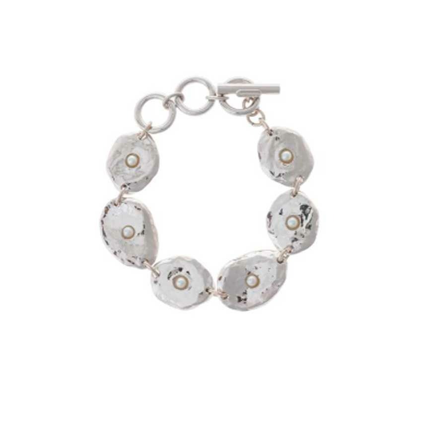 凸の質感やそこにあしらわれた主張しすぎないパールの装飾が粋なデザイン性の高い大振りブレスレット。