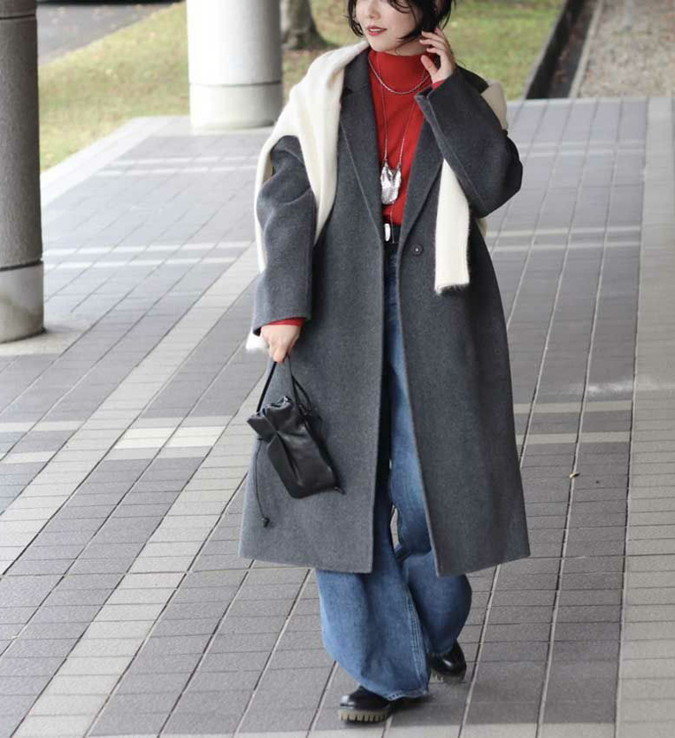 ボタンを閉めずに羽織るだけで、アウターの中心に縦のラインが生まれ、視線が上下へ流れてスッキリした印象をつくることができます。
