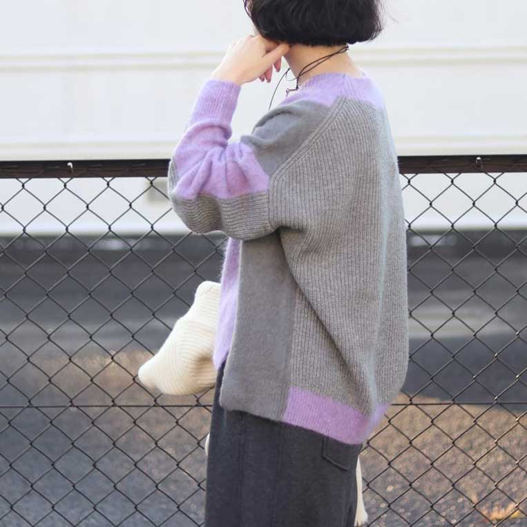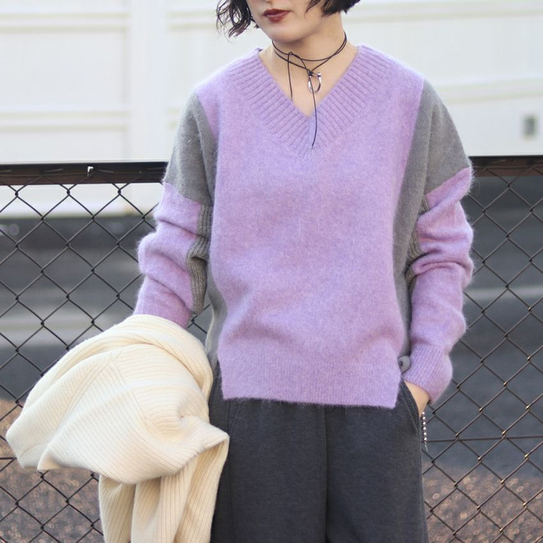 アルパカシャギーニットを使用した柔らかく落ち感のあるVニット。