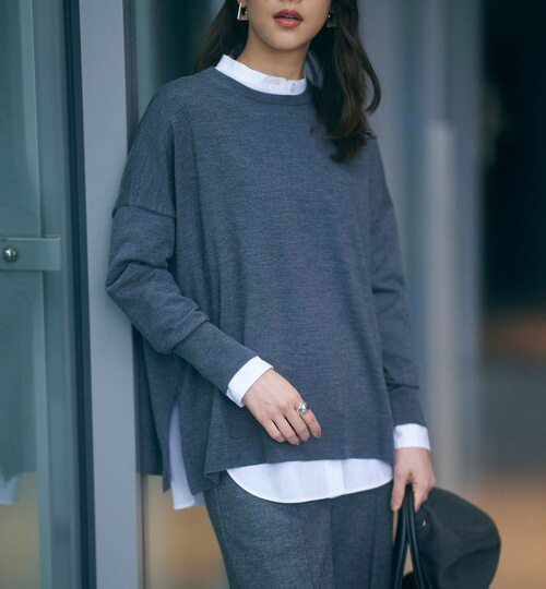 そこでおすすめしたいのが落ち感のあるニット。身体に程よく沿う柔らかな素材が縦のラインを自然につくり、スッキリとした大人の上品さを演出してくれます。