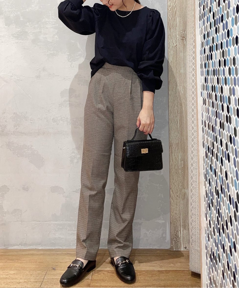 ハイウエストパンツを取り入れたり、トップスを軽く前インすることで腰の位置が高く見え、脚がスッと長く見える効果があります。