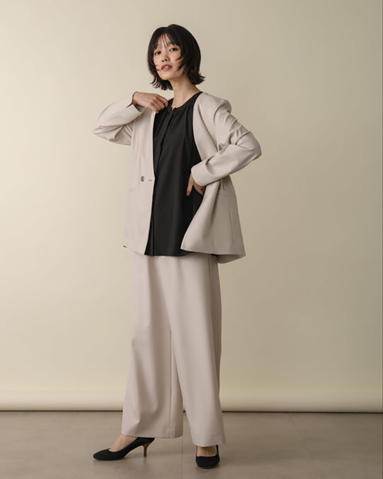 カチッとしすぎないジレや、光を味方につける微光沢のブラウス。百貨店ブランドにも引けを取らない上質な素材感は、公式な場でも自信を持たせてくれます。